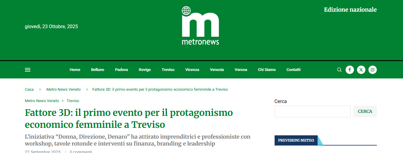 Il 21 settembre 2025, all’Hotel Maggior Consiglio di Treviso, si è svolto con grande partecipazione l’evento “Fattore 3D – Donna, Direzione, Denaro”, promosso dal Circuito Donne Imprenditrici S.r.l., startup guidata da Giorgia Bonotto e coadiuvata da Elena Borghi.
